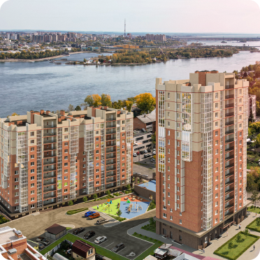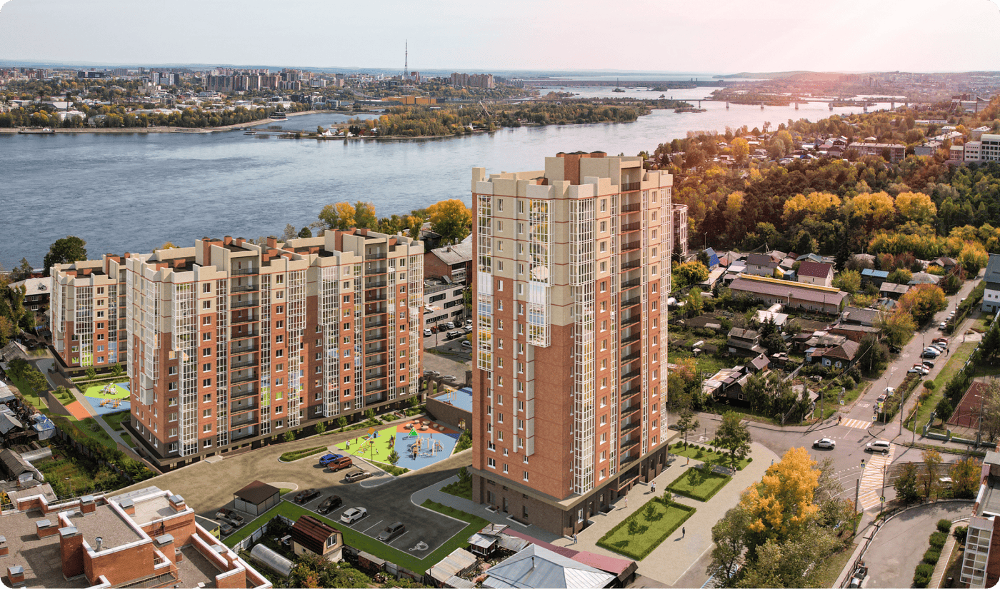 Квартал окружен зелеными парками и рощами, а из окон открывается живописный панорамный вид на реку Ангару.